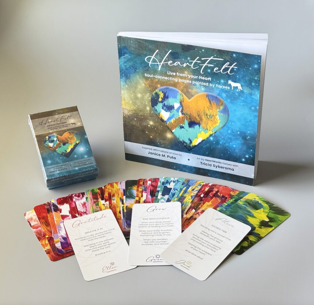 This journey has led her to focus her coaching by designing structural tools such as a 210-page book and a unique deck of cards that can be used independently of each other as preferred by the user. Using her creative poetry and writings, she teamed up with Tricia Sybersma, an artist who blends horses and painting. Tricia was inspired to use eight horses to create this intuitive art. With a simple way to use non-toxic paint laid out on paper, then covered with a protective cover so that the horse doesn’t have contact with the paint, it’s finally sprinkled with compressed hay on top. The horse gently nibbles and nuzzles the surface to produce a stunning blend of colors and energy when the painting underneath is revealed.