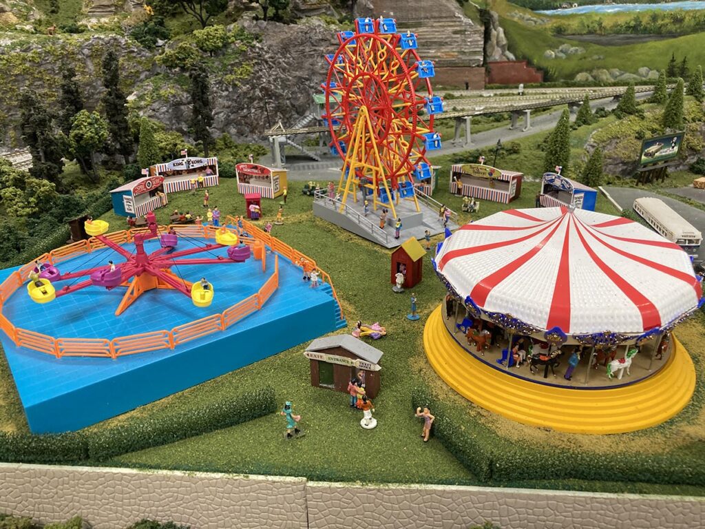 The Model Railroaders invite you to visit the Hobby Building Model Train Room to view our Labor Day carnival scene. The residents will be relaxing with their families and enjoying the carnival, picnics in the park, flying R/C airplanes, playing sports, boating, fishing, hiking, rock climbing, spelunking, and enjoying their favorite beverage.