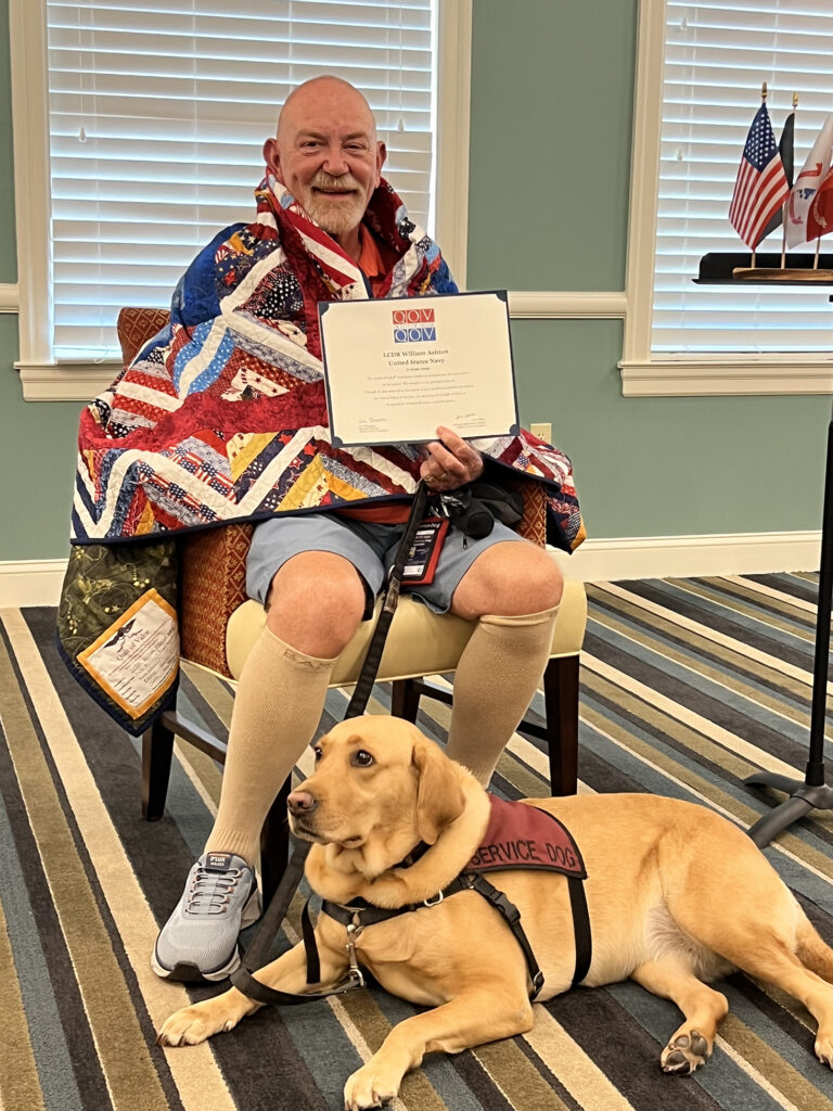 At Canterfield of Ocala, Terry Miller presented the Quilt of Valor to Lieutenant Commander William B. Ashton, U.S. Navy (Ret.). Bill served for 23 years, much of it in the submarine force, along with prestigious assignments in the Pentagon.