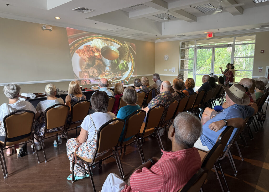 On Friday, Aug. 15, the Arbor Conference Center Dance Studio I was filled with the aromas of spices, simmering tomatoes, and rich cream as more than 60 residents gathered for a lively culinary demonstration. Attendees were treated to an engaging exploration of one of India’s most beloved dishes – butter chicken – guided by Shashi Ray and Usha Vargas.