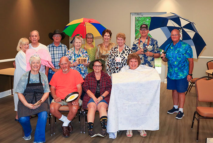 Fran had a huge umbrella, a yellow raincoat, and boots. She sang “Raindrops Keep Falling on My Head.” Vicky is always entertaining. She had on dark glasses and sang Stevie Wonder’s “For Once in My Life.” She went to the piano and played along during the musical breaks. Diane wore four red Ace of Hearts playing cards around her neck. She sang the Four Aces song “Heart of My Heart.” Peyton had his camera around his neck and sang Paul Simon’s “Kodachrome.” Dave had a big golf umbrella and sang Gene Kelly’s “Singing in the Rain.” We were wondering if he was going to dance in the puddles.